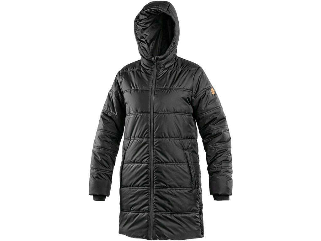 Dámský zateplený kabát s kapucí a bočním rozparkem na druky. Boční kapsy na zip rukávy ukončeny pružnou manžetou černé reflexní doplňky na kapuci rozparku a podél hlavního zipu vnitřní kapsa na zip.