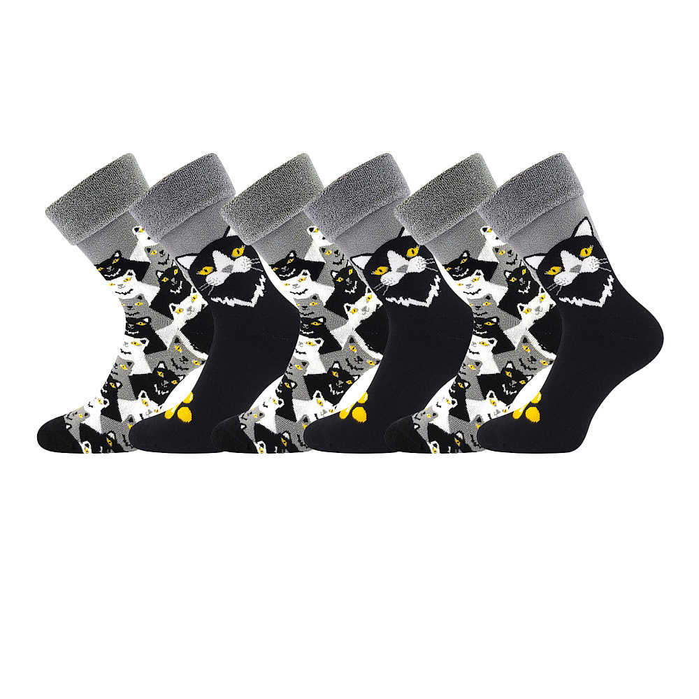 Dámské silné ponožky Lonka® LÍZA s obrázky kočiček. Ponožky mají vysoký podíl bavlny a pružného elastanu. Díky tomu jsou ponožky jemné na omak příjemné na nošení dobře pohlcují vlhkost a zároveň dobře drží na noze. Teplé ponožky jsou z jemného a měkkého froté jsou tak velice příjemné vhodné na běžné nošení v chladných a sychravých dnech. Špici mají ponožky spojenou řetízkováním a spoj nikde netlačí. S ohrnovacím lemem nebo se dají nosit i natažené. Párování 1 + 1 ve kterém je každá ponožka jiná ale dohromady tvoří dokonalý pár. Pokud chcete mít dvě stejné ponožky objednejte si dva páry.